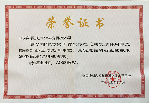 江苏J9国际站登录涂料在2015年中战绩喜人,作为《建筑涂料用罩光清漆》的主要起草单位,掌握着核心罩光漆研发技术,并因这一颇有含金量的科技实力,而成为化工行业罩光清漆标准制定的核心成员,被全国涂料和颜料标准化技术委员会授予“积极贡献奖”。